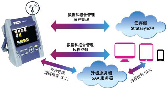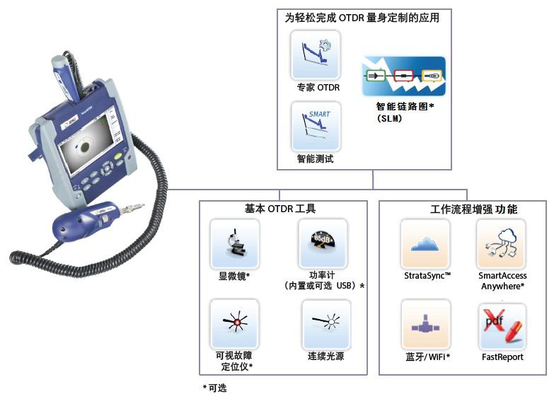 多個(gè)連接選件(通過 USB 和可選的藍(lán)牙/WiFi 進(jìn)行 3G/4G 智能手機(jī)連接)可實(shí)現(xiàn)遠(yuǎn)程控制,并可與平板電腦、智能手機(jī)和計(jì)算機(jī)來往傳輸數(shù)據(jù)及工作指令。SmartOTDR 可實(shí)時(shí)快速解決現(xiàn)場問題,可選的 SmartAccess Anywhere (SAA) 可在云中開辟一條隧道,使技術(shù)人員能夠遠(yuǎn)程訪問和操作儀器。SmartOTDR 與各種各樣的云服務(wù)器 (WebDAV 服務(wù)提供商)兼容,還可使用自帶的 FastReport .pdf 報(bào)告生成功能即時(shí)共享測量報(bào)告。