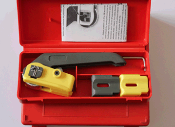 KMS-K縱向開纜刀(俗稱“爬山虎”),是光纜施工及維護中用于縱向開剝光纜的工具。工具本身由手柄、齒輪夾、雙面刀、以及偏心輪(可調(diào)四個位置)組成。調(diào)整偏心輪的四個可調(diào)位置可適應于剝除不同外護層厚度的光(電)纜。雙面刀刀刃材質(zhì)特殊、鋒利而耐用。隨工具還配送有黑色及黃色光(電)纜專用適配器、內(nèi)六角起子、包裝盒及操作說明。黃色適配器專用于光纜,黑色適配器則適用于小于25mm的電纜;內(nèi)六角起子則用于更換雙面刀。